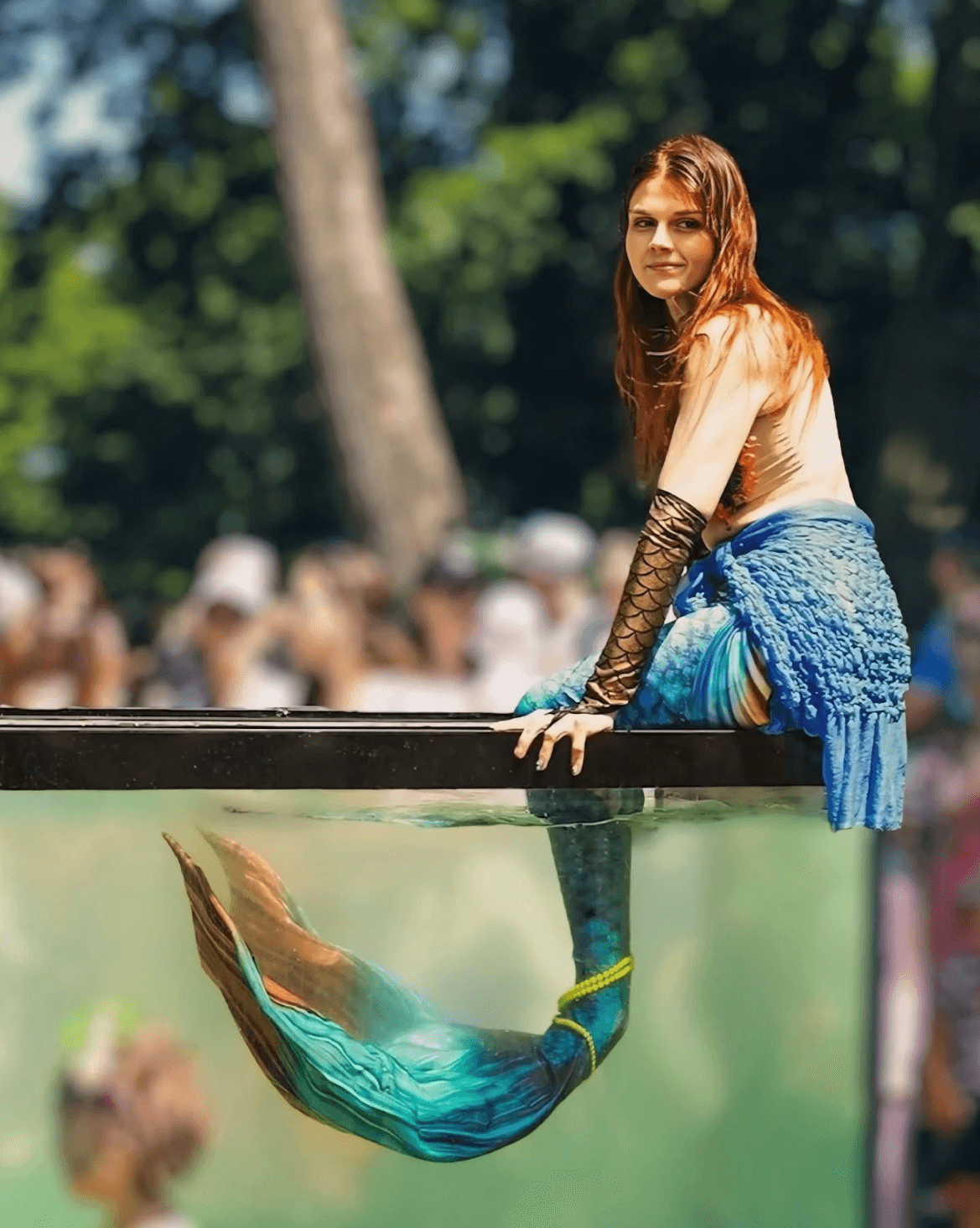 Letité zkušenosti jako profesionální mořská panna s propracovanými kostýmy a vystoupeními.